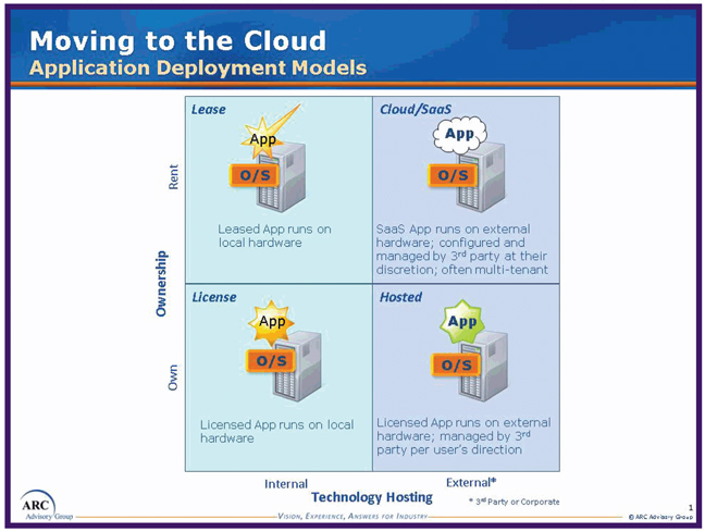 Image 1: ARC, page 4. Cloud-based can be purchased as hosting services for a user application or as software as a service. Diagram supplied by ARC Advisory Group.
