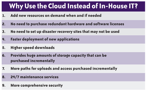 For example, data storage and backup have traditionally been the realm of in-house IT departments that install and manage the software, servers, etc. However, many businesses are choosing cloud providers for data storage because economies of scale result in extremely low fees. For this and other applications, using a cloud provider eliminates or dramatically reduces labor, purchasing and maintenance costs associated with implementing an in-house solution.