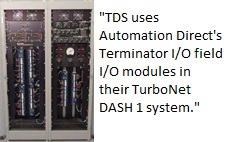 TDS uses Terminator field I/O modules from AutomationDirect, and has developed a protocol to communicate with redundant control processors via the Terminator I/O’s Ethernet network interface. TDS uses all of the standard Terminator I/O modules and has developed low-density termination boards that, interposed between the I/O modules and the field I/O, provide suppression and fuse protection as required, as well as standard contact relays operated by the output modules. With three nodes of Terminator I/O modules, each individually powered and with separate Ethernet interfaces, the system is able to handle triple redundant field I/O. The hot-swappable I/O modules allow non-critical or critical redundant I/O to be changed online.