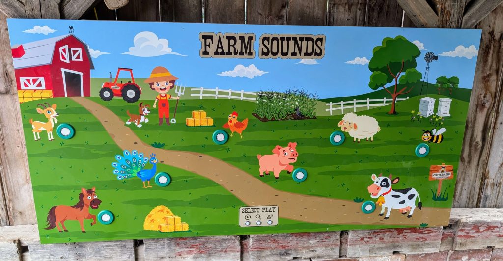 One of our earliest attractions is much like a large size see-and-sound board. It is called “Farm Sounds” (Figure 1), and guests can push a button to select one of three play modes. The first mode let the guests press a button near the picture of an animal to hear the sound it makes. The second mode is a trivia game where guests are given some facts about a particular farm animal, and they match the animal to the facts. The third mode is like the game “Simon”, where the board creates a series of farm animal sounds and guests try to repeat the sequence. If the guest succeeds, then the series gets progressively longer and more complex.