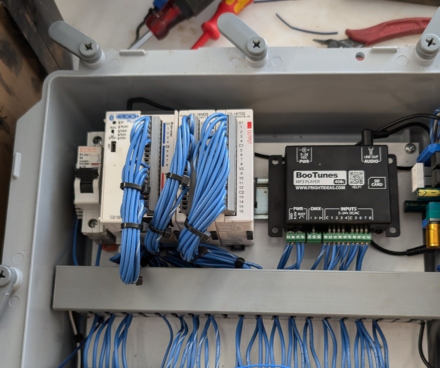 Behind the scenes, our go-to controller for monitoring signals and commanding outputs and animatronics is an AutomationDirect CLICK PLUS stackable micro modular PLC. This platform offers a multitude of useful capabilities, including easy programming using free software. Depending on the options selected, nearly any kind of input/output (I/O) signal can be accommodated, while built-in wired Ethernet and available Wi-Fi provide convenient connectivity. Wi-Fi is especially important for farm locations because they usually don’t have wired infrastructure, and they often cover large areas. Serial communications are available for specialty applications, such as communicating with some sound amplifier boards.
