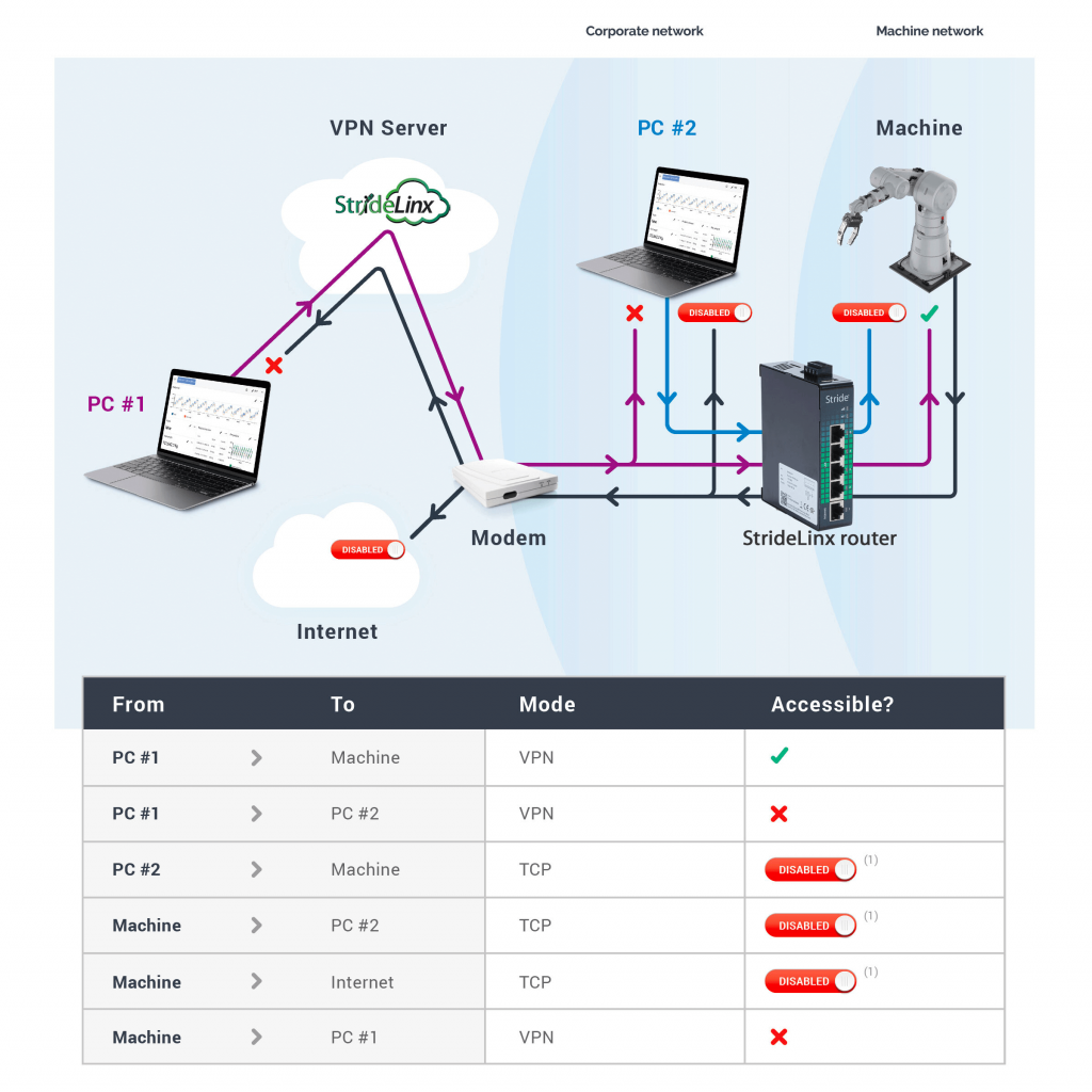 Established technologies, such as a virtual private network (VPN), are almost always part of the solution. It is recommended that users work with a reputable VPN provider familiar with the industrial manufacturing industry. The AutomationDirect StrideLinx portfolio of hardware, VPN, and cloud services is designed specifically for machine builders and systems integrators, and it provides verifiable documentation and certifications to support any implementation.