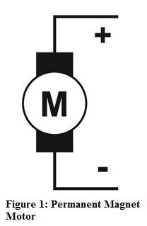 There are several types of DC motors, including shunt, series, compound wound or stabilized shunt, permanent magnet, and brushless DC. The main differences between these types of motors revolve around how the electromagnetic fields are generated. The IronHorse DC motors are Permanent Magnet motors: the magnetic field in the stator is supplied by permanent magnets positioned just inside the frame of the motor. The magnetic field in the rotor is produced by the applied voltage. Permanent Magnet motors are simple to operate: there are only two wires to hook up. (Fig. 1)