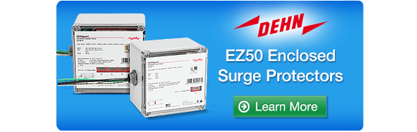 These rugged surge protectors are NEMA 4X rated, include hardware for wall or panel mounting, and come prewired with 10 AWG, 36” stranded wires for quick and easy installation. Dehn EZ50-S surge protectors provide 50kA IMAX and 200kA SCCR surge protection, offer field-replaceable (hot swappable) plug-in modules, and feature per line visual indications to quickly identify the failure source.
