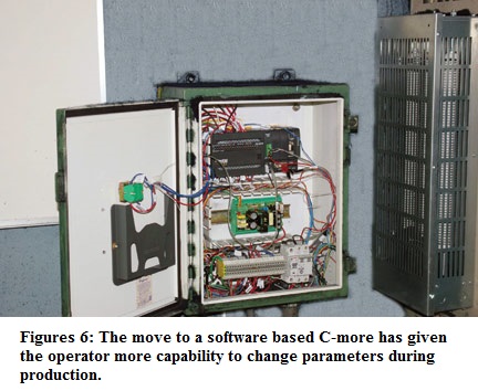 The re-beamer is now equipped with a DirectLOGIC DL06 PLC, a Durapulse AC variable frequency drive, a proximity sensor and a C-more operator interface panel. Because the outsourced PLC program never worked correctly, it was scrapped and rewritten in-house. This allowed placing more parameters and adjustments at the operators’ fingertips. Additionally, operators continually suggest improvements to the process or machine, and now system programmers are able to act on their inputs, and use the software based control system to streamline the process. (See Figures 5 & 6)