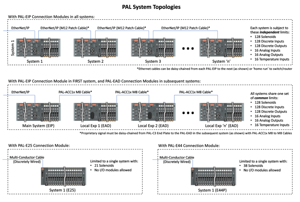 Many installation topologies are available. The PAL offers multi-conductor hardwiring options, but electro-pneumatic components are even more effective for minimizing wiring and maximizing data transfer when they are implemented using an industrial Ethernet protocol, such as EtherNet/IP.