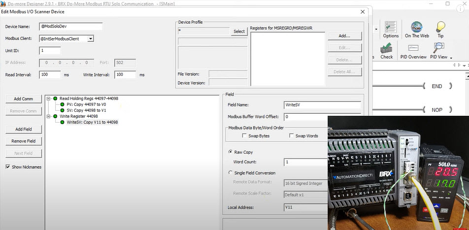 The Do-more BRX PLCs are very powerful controllers that utilize device-centric programming, allowing common functions to be configured as “devices” that run in the background without any ladder code and independent of the PLC scan. One such function is Modbus communication which, with the release of Do-more Designer 2.9.1, can be done via the new Modbus Scanner Device. This device can be configured for any combination of up to 32 Modbus/TCP or Modbus/RTU servers and will perform any required data format conversions all behind the scenes, streamlining ladder code development and greatly reducing its complexity.