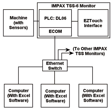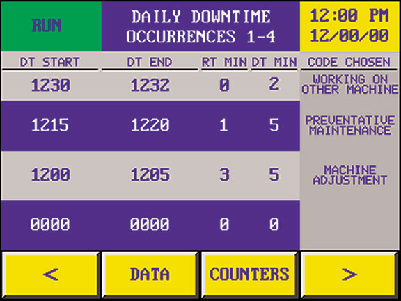 Using one of the new IMPAX TimeSaver System (TSS) monitors on each machine produced a basic downtime recording system that worked very well. For data access, we developed a data collection program using LookoutDirect, a PC-based HMI and acquisition package, to collect the numbers from the PLCs across a serial network and display them in real time.