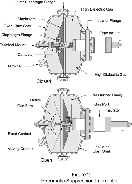 There are principally four methods used to lengthen an arc: long-throw contactors, pneumatic suppression, magnetic suppression and arc dividing. Long-throw contactors have the disadvantage of being disproportionately large in comparison to other techniques; therefore, these devices are not commonly used. Pneumatic suppression is typically used for switching situations which deal with extremely large inductive energies. Pneumatic suppression interrupters, as illustrated in figure 2, are most commonly used to switch large elements of the power distribution grid throughout the United States.
