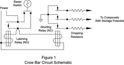 It consists of a holding relay that controls one or more shorting relays; in this case, a single, normally closed, three-pole unit. The shorting relays are configured to discharge any stored energies within the main circuit. In some cases the stored energies may be high enough to require some sort of dump load, as shown in the illustration. These dump loads are typically in the form of a high wattage resistor. Crowbar circuits are commonly designed to automatically reset, but they may also carry a manual reset key. (In this case, the circuit shown contains a manual reset.) Intended to add another level of safety to the equipment, the manual reset assures that the equipment cannot be reenergized without a specific action from a technician.