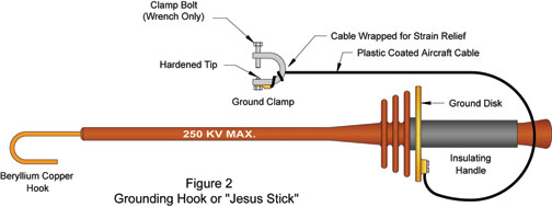 These units consist of a copper bar bent with a long-leg hook. The shaft is insulated and the opposite end has two handles with a high voltage hand guard. A plastic-coated piece of aircraft cable is connected to a copper plate and bar. The opposite end of the cable is connected to a bolt-on ground clamp. The bolt-on clamp assures that the ground connection can’t be casually or accidentally disconnected.