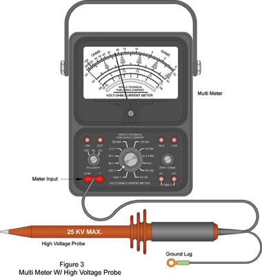 Troubleshooting high voltage equipment is typically done with specially designed high voltage meters or ordinary multimeters equipped with specialized high voltage probes, as shown in Figure 3. This particular probe is rated at 25 KV and has a 100 to 1 attenuation factor. The meter is set to the 250 volt range and the probe is connected to the input terminals. The technician simply multiplies any reading by 100 to determine the circuit voltage. (Figure 3)