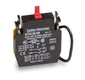 The E22 self-monitoring circuit contact block by Eaton/ Cutler-Hammer has an additional circuit to monitor its proper attachment to the Emergency Stop operator. While this configuration is not a requirement of the EN418 specification, it is an enhancement to overall E-Stop integrity especially where safety relays are being used. Without the self-monitoring circuit contact block, the E-Stop becomes a weak link in the E-Stop/safety relay circuit.