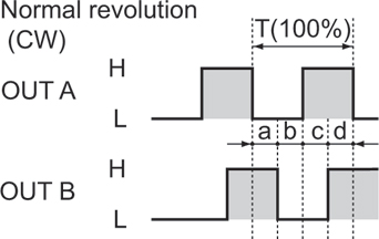 All encoders from AutomationDirect are also quadrature encoders. Quadrature encoders utilize two different sets of “slots” on the optical disc inside the case. These different sets of slots are referred to as channels and are typically called “A” and “B”. The “A” and “B” slots on the encoder disc are offset so that their outputs are out of phase by 90 degrees. This results in 4 different “states” (see a, b, c, and d in the picture below) that the combination of the outputs could be in for any given disc position. This timing diagram comes directly from an insert that ships with an encoder: