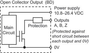 A second output type is an open collector. NPN open collector encoders “sink” current from sourcing (PNP) PLC inputs, and require only one wire per channel, plus one 0V (DC common) wire for all the current return. An open collector encoder would have A, B, Z, and 0V wires (and a wire for +DC to power the electronics). NPN Open Collector (sinking) encoders require the master PLC or motion controller to have PNP (sourcing) inputs. Open collector encoders usually accept a wide range of voltage. AutomationDirect offers models with ranges of 5–12VDC, 12-24VDC, and 5-30VDC. (Image 4)