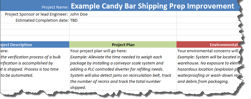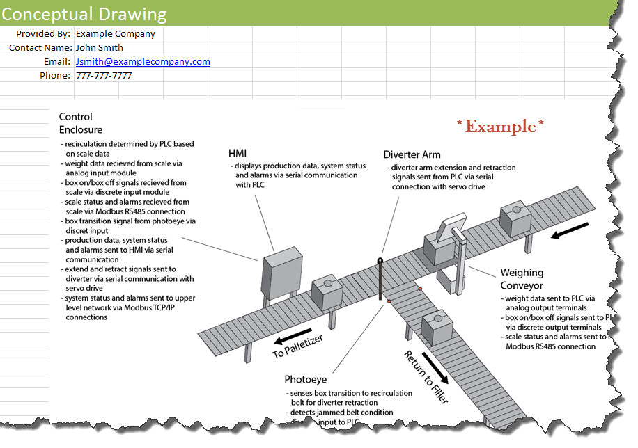 Below is an example of how the automation will work and the planning involved. First, the static scale will be replaced with a conveyor scale so we can alleviate the belt stoppages. The conveyor scale will communicate with a PLC (programmable logic controller) inside of our control enclosure. The scale will inform the PLC when a box is present, the weight of the box and when the box has cleared the scale. The PLC will then determine if the box needs to go back to be refilled or not. If it does need to be refilled, a diverter arm will extend and guide the box to the recirculating conveyor belt. At this point, we have a puzzle and we know the finished picture. We now need to specify the pieces. To do this, I am going to use a spreadsheet. You can download the example spreadsheet by clicking here; feel free to use this spreadsheet as an equipment specification template for your project.