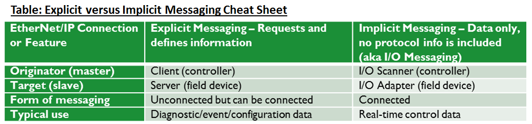 EtherNet/IP uses implicit messaging, sometimes called I/O messaging, for time-critical applications such as real-time control. Implicit messaging is often referred to as I/O messaging because it’s frequently used for communication between a controller and remote I/O. It’s a much more efficient communication connection than explicit messaging as both the client and server ends are pre-configured to know implicitly or exactly what to expect in terms of communication.