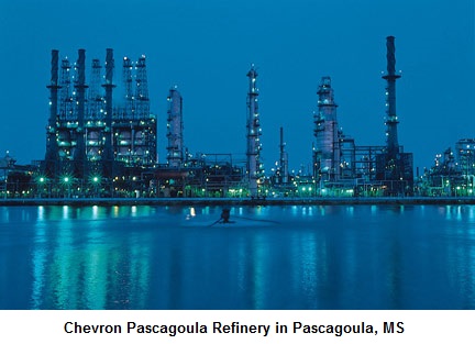 An oil company’s competitive edge depends upon how efficiently they can convert the crude oil’s middle distillate gas-oil and residuum into the highest value products. The Pascagoula Refinery converts middle distillate and residuum into primary gasoline fuel (to name one) by using other processing plants that “crack” large, heavy molecules into smaller, lighter ones. The Fluid Catalytic Cracker (FCC) uses high temperature and other catalysts to crack 63,000 barrels (2.6 million gallons) each day of heavy gas-oil, mostly into gasoline. Hydrocracking uses catalysts to react gas-oil and hydrogen under high pressure and high temperatures to make both jet fuel and gasoline. Chevron is an industry leader in using this technology to cost-effectively convert medium-heavy weight gas oils. There is also “cat cracking”, which is the basic gasoline making process and involves intense heat, low pressure and a powdered additive to accelerate the chemical reaction. Some refineries also have cokers, which use heat and only moderate pressure for conversion.