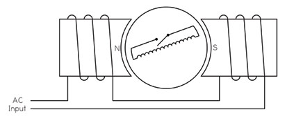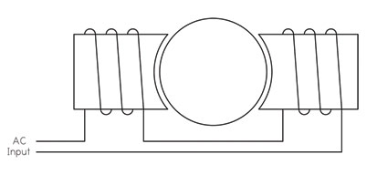 The DynaMotor™ is constructed like a DC motor, or universal motor with two or more opposed salient poles whose copper windings are connected directly to the AC line.