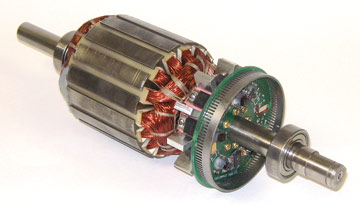 The rotor is similar to universal and DC motors, consisting of slotted steel laminations stacked on a shaft. Copper wire is wound in the rotor slots and the ends of each coil are connected by a solid-state switch, such as a transistor. In contrast, universal and DC motors have each coil connected to copper bars in a commutator that receives external power through carbon brushes.