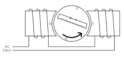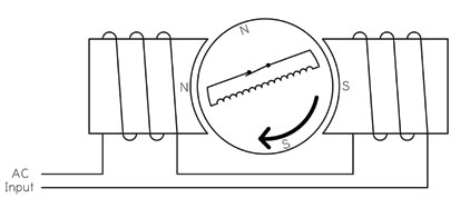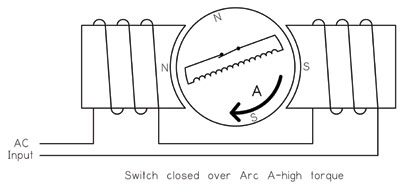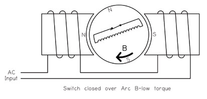 When the stator windings are connected to an AC line, a resultant magnetic field varies with the line current and magnetic poles are created. The stator flux passes through the rotor inducing a voltage in each rotor coil by transformer action. However, with the switch open, no rotor current can flow and no torque is produced.