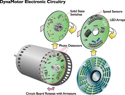 The DynaMotor looks like an ordinary AC or DC motor. It is the same shape and size, and is made from the same mechanical parts, laminations, windings, shaft, end-bells, bearings and housing. The difference is that the DynaMotor™ uses optically controlled solid-state switches embedded in its rotor windings. Opening and closing these switches controls the current, and thus the torque, right where it is being produced. The result is a self-contained variable-speed motor.