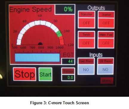 A view of the engine “start-up” screen showing the temperature, speed, and inputs/outputs from the PLC is shown in Figure 3.
