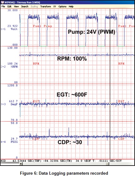 From data logging the engine supplies and from the limited documentation, it was found that the controller would start the engine with a constant output PWM to the fuel pump. Once 50% speed is achieved, the output transitions to a PID loop where PWM output is varied as required. A screen shot of four of the parameters recorded during data logging is shown in Figure 6.