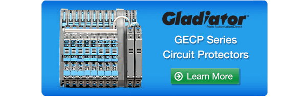 September 13, 2023 – AutomationDirect has added Gladiator GECP series modular 12/24 VDC circuit protectors to their selection of electronic circuit protection devices. The GECP series offers both fixed trip current versions and a version with an adjustable trip current range and adjustable trip characteristics. LED signaling with output alarms allows real-time status monitoring. This series is compact, lightweight, and available at a very low cost per channel.