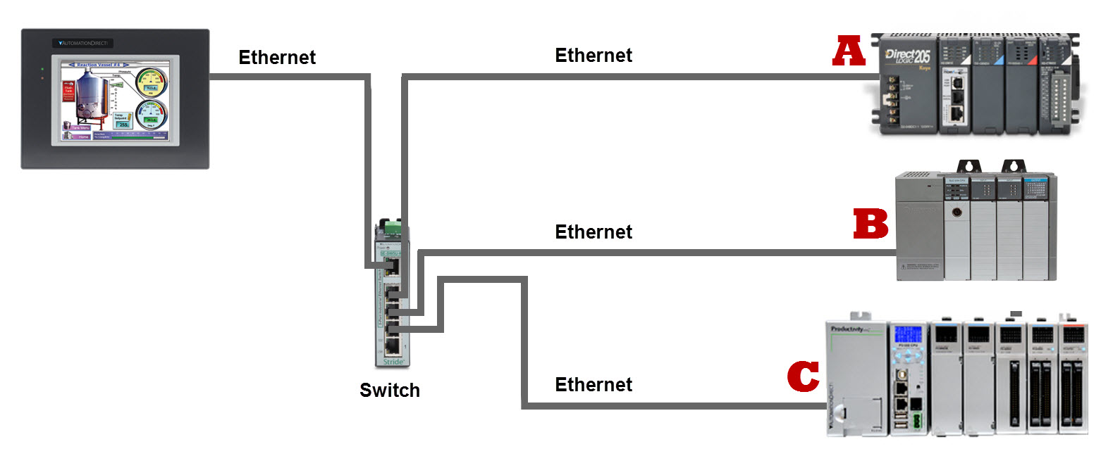 Ethernet has the great advantage of being able to carry multiple protocols simultaneously on one network, making it feasible to link many different controllers to one HMI on a single Ethernet network. For example, let’s say controllers A, B and C all have Ethernet ports but use different communication protocols such as Modbus TCP/IP, EtherNet/IP and simple Ethernet IP. That’s not a problem, since one HMI can still talk to all three in spite of the protocol mix.