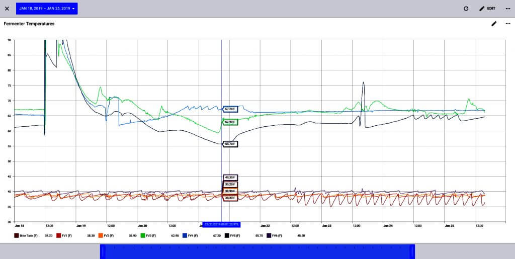 Fermentation vessel temperature data logged to the cloud is visualized as live graph data using AutomationDirect’s hosted VPN solution.