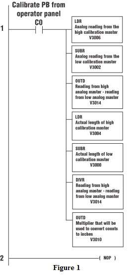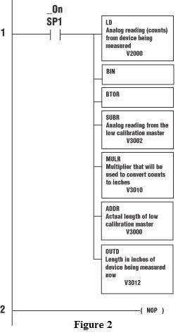 The following ladder logic will calculate the length from the counts and store the resulting length in V3012/V3013. The analog reading from the device being measured is stored in register V2000. See Figure 2