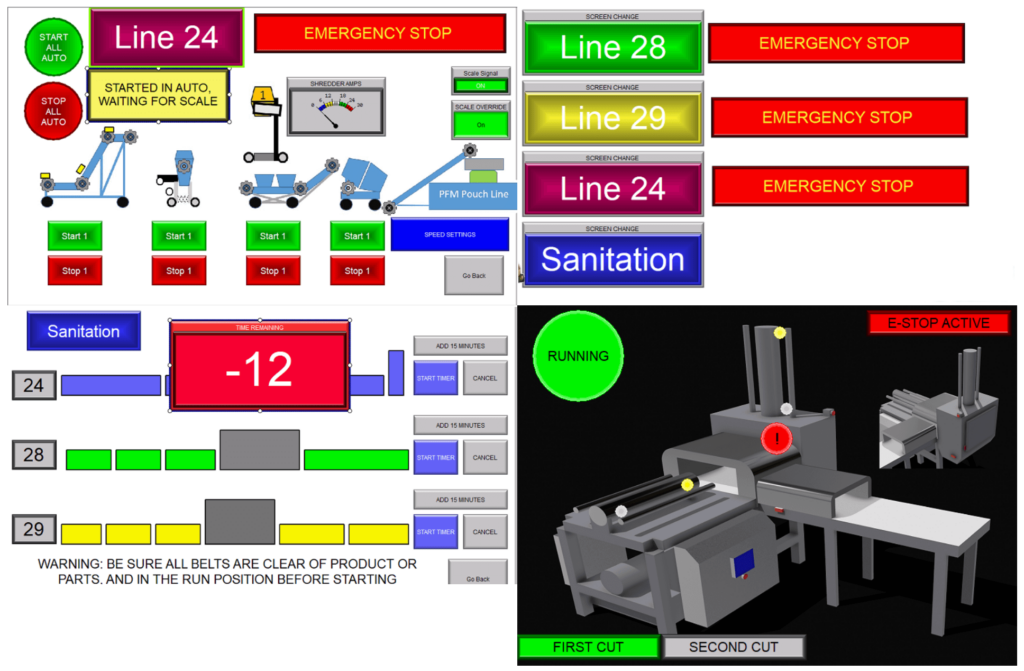 However, the existing systems were largely manual and hardwired, even though some equipment came with legacy PLCs. There was no HMI, the machinery was sometimes poorly coordinated upstream/downstream, and stoppages happened frequently, often for no apparent reason. Product changeovers required significant effort and adjustment.
