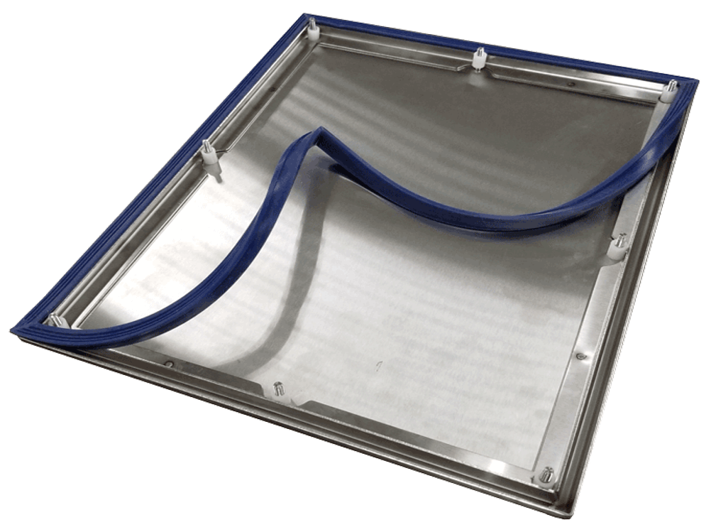 Gaskets are necessary to keep water out but can cause contamination issues if not properly implemented. The most rigorous designs may use both a permanent inboard gasket and a serviceable outboard gasket. Gaskets must remain flexible and never off-gas, and blue silicone material may be used so contamination is more easily spotted during cleaning. Doors may be removeable for deep cleaning.