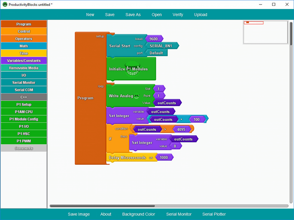 Users can be assured that the ProductivityOpen with a serial module provides a solid platform so they can develop whatever functionality is needed. They can use standard C++ and take advantage of code snippets available via GitHub, or use the free ProductivityBlocks graphical programming interface, or combine these and other programming languages and function blocks in a single application.