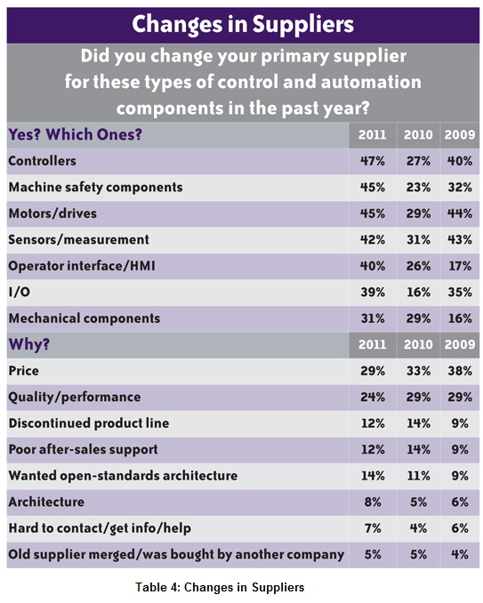 “With some relief from the pricing pressure, we find upticks of poor after-sales support causing users to switch,” the Control Design cover story said. “Although only 14% of the respondents say they changed suppliers because of it, that’s twice the rate of 2008. After price and quality/performance, 19% of the 40-49ers noted poor after-sales support as their reason to change suppliers, compared with only 7% of the 20-29ers and 9% of the 50-59ers.”