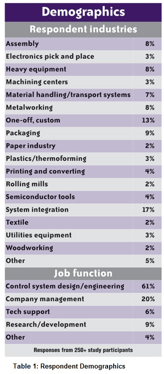 Machine and robot builders are increasingly turning to the Internet for product research. The Internet has become a legitimate avenue for researching automation products needed by machine and robot builders, and the use of vendor websites is emerging as the primary method for doing product research. Control Design magazine began asking its readers about their product research and buying preferences in 2006. The results of the annual survey appear in the magazine (and online)—highlighting product research trends, issues and occasional surprises. In 2007, the magazine began including questions about use of videos, podcasts, blogs, and webcasts. This year, the magazine asked about social media as an information delivery tool. The respondent demographics for this year’s survey are listed in (Table 1).