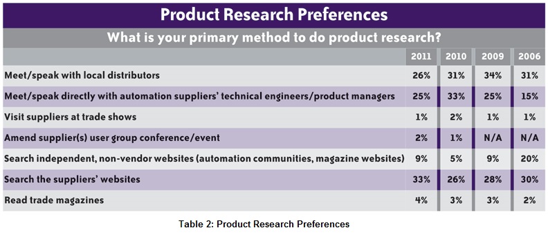 Control Design always asks the study participants about their primary method for doing product research. “For the first time since we began this annual study, the use of vendor websites significantly outpolled the use of local distributors as the single most-preferred product research method,” said Joe Feeley, editor-in-chief and author of Control Design’s March 2011 cover story, “Sign of the Times.” “Meeting directly with the manufacturers’ product experts took a significant dip, returning to 2009 levels,” added Feeley. The survey results reveal some differences among the age groups. In response to the question: “What is your primary method to do product research?”, the findings were that: “Overall, 33% said searching supplier websites is their primary method,” observed Feeley (Table 2). “But 44% of the 30-39 year-old group noted that as their primary method, compared with 28% of the 40-49 year-old group and 37% of 50-59ers,” said Feeley.
