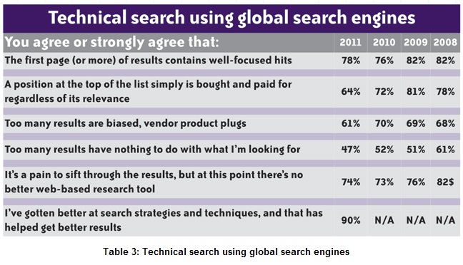 “For the first time, less than half the respondents agree with the statement that global search turns up too many outdated results. In 2008, 61% agreed with the statement,” Feeley said in the cover story.