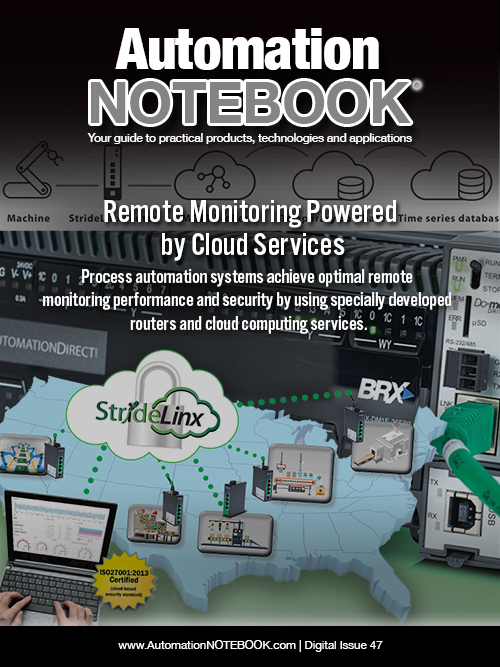 This issue of NOTEBOOK is full of interesting and educational articles including our Tech Threads, which discuss important VFD safety features and how process pump automation can enhance pump performance. We also have a great Cover Story on the benefits of implementing an end-to-end remote access solution that utilizes cloud technology. The User Solutions show how pneumatics and open-source control were used to turn discarded bottle caps into works of art, and how CLICK PLCs helped to quickly produce sanitizing products used to combat Covid-19. Our Student Spotlight discusses how AutomationDirect components helped Georgia Tech students melt metal with their homemade induction furnace. For information about exciting events happening in and around AutomationDirect, including some recent product awards, take a look at the Business Notes. In this issue, you’ll also find information on our newest products, such as Quadritalia modular enclosures, the new CLICK PLUS 2-slot CPUs, Norgren air preparation components, UPS-capable DC power supplies, additional ReeR Mosaic safety controller components, and more. As always, the Break Room is stocked with fun and challenging brainteasers, so give them a try and see how many puzzles you can solve.