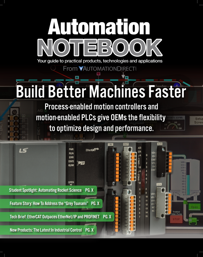 Welcome to the fall issue of AutomationDirect’s NOTEBOOK, your guide to practical products, technologies, and applications! This fall season has been difficult for many of us in the direct path of Hurricanes Helene and Milton. Our thoughts are with everyone personally impacted. From a business standpoint, AutomationDirect is paying close attention to the supply chain given the disruption to transportation routes in parts of the southeastern U.S. In addition, the recent dockworker strike across 36 ports on the east coast may also have affected AutomationDirect’s suppliers. Product availability is a toppriority for the company’s customers. As such, a statement on actions taken as countermeasures can be found here. In this issue of NOTEBOOK, we continue to explore the many ways industrial automation products are making a difference. In our cover story, we dig into the evolution of motion controllers and PLCs looking at how the lines are beginning to blur between the two. Motion controllers are now equipped with multiple I/O points, can support a variety of network protocols, and are capable of handling PID control, making these controllers just as sophisticated as the PLC. Meanwhile, PLCs are going beyond basic machine control and expanding into safety and motion, as well. But the two technologies are not synonymous in every way. On page 10, AutomationDirect’s Kevin McClelion and Joe Scoccimaro explain how to choose between the two. In a technical brief, Joe Kimbrell, product manager for motion control products at AutomationDirect, explains the difference between Ethernet communication protocols. Turn to page 22 to learn more. In a separate story on page 24, Joe offers an overview of encoders, providing details on what they are, how they can be configured, and how to choose the right option for your application needs. We also dig into some examples of how industrial automation can be used outside of the factory floor. In the success story “Automating a Luxury Bus” on page 27, we learn how Mark McHenry, founder of Systems & Controls, has leveraged his systems integrator skillset within the custom coachbuilder industry. Speaking of system integrators, turn to page 4 to learn more about AutomationDirect’s Systems Integrator program that connects end users of all sizes with SIs ready to support their automation needs. Connecting people is important, especially given the current workforce crisis. A second feature story shines a spotlight on the growing skills shortage. It’s estimated that nearly 350,000 people are retiring from the manufacturing industry annually — and they can’t fill those roles fast enough. Even with automation advancements, the industry still needs people. AutomationDirect education specialist Chip McDaniel addresses the issues on page 17. There is much more to explore in the following pages of NOTEBOOK. Please take a read, pass it along to your colleagues, and send us a note if there’s something you want us to cover in an upcoming issue!