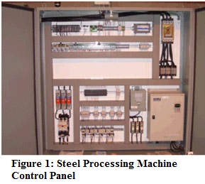 Because the old control system utilized a two-speed reversing motor starter to control the machine’s main motor, constant speed changes caused a great deal of mechanical wear to the machine. When the old system was upgraded, the starter was replaced with a DURApulse drive. (Fig. 1) This upgrade allowed the machine to accelerate smoothly between speeds, thus greatly reducing mechanical wear. The machine now runs at its most efficient speed during every phase of the production cycle.