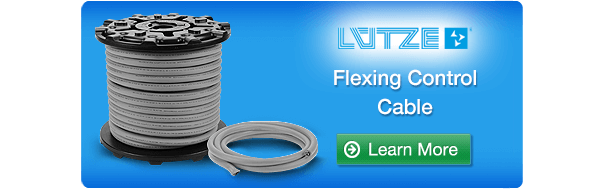 July 12, 2023 – AutomationDirect has added LUTZE SUPERFLEX® control cable that is well suited for short to medium length articulated drag chain (C-tracks) installations requiring moderate to high performance. The High Glide TPE insulation and PVC outer jacket provides resistance to sunlight, oil, and moisture penetration, and makes this cable suitable for indoor wet and dry applications or outdoor installations. Cables are available with conductors in 21 AWG to 12 AWG sizes, with up to 34 conductors including ground, and is made in the USA. Order this cable cut to length in 1-foot increments with a 20 ft. minimum, starting at $0.78 /ft.