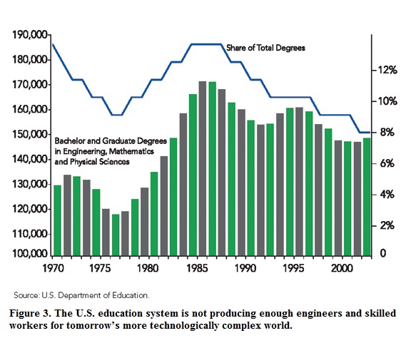 According to the report, in 2000, 23 percent of all undergraduate degrees awarded globally were in natural science or engineering. The U.S. was far below the average at 11 percent, while China, at 50 percent, was far above.