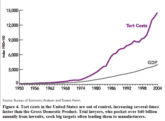 Perhaps one reason fewer people are going into engineering is that our runaway tort system makes it much easier to take wealth than create it. Rising tort costs are, in fact, one of manufacturing’s biggest concerns. Although the U.S. economy is growing at a healthy clip, tort costs are increasing many times faster, a trend that seems to have started around 1974. In Japan, France, Canada, and the United Kingdom, tort costs are less than one percent of the GDP; in the U.S., they’re more than double, amounting to $250 billion a year, much of it sucked from the manufacturing sector.