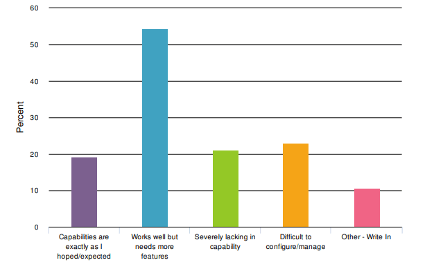Many users have a good mobile connectivity experience, with over 70% saying the capabilities are as they expected, or it works well but could use some more features. A good portion of respondents still find mobile access lacking in capability or difficult to manage. Some write-in answers mentioned concerns about security, latency, and even safety.