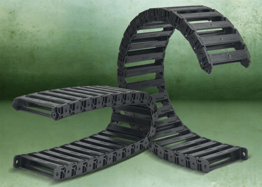 MP3000 series cable/hose drag chains feature hinge and latch crossbars, allowing convenient access to the chain’s channel after installation. In addition, they can be easily extended or shortened to fit the application by adding or removing chain links, and have end brackets that provide secure mounting points. Also available are accessories that provide additional support and complement drag chain operations.