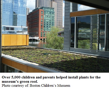 Topping off Boston Children’s Museum is an extensive green roof of plantings and organic materials. Working with the Museum’s staff, “Green Team” interns and guest scientists, more than 5,000 children and parents participated in preparing and installing the plants that form the visible green roof over the Museum’s entrance. A highly visible demonstration of Boston Children’s Museum’s green agenda, the green roof sedum and flowering plants will cover a 6,400-square-foot surface.