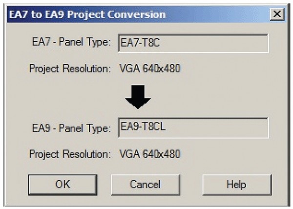 The EA7 C-more series resolution on some panels was lower than the EA9 series. For projects created in software versions previous to version 5.0, the original resolution will be maintained when the project is saved into the new format and the user has the option to reconfigure the resolution size under the panel settings in the software at any point after conversion.