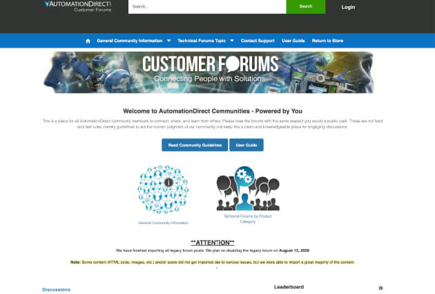 The new AutomationDirect Customer Community is a place where like-minded professionals can engage with each other and share knowledge, offer advice or exchange ideas. Inside the community you’ll find technical forums that are active with thousands of users including hobbyists, engineers and even some of our development partners. There is also a Knowledge Base which provides numerous resources including example programs, FAQs and how-to videos. The General Community Information section includes read-only topics such as new product announcements, firmware/software updates and includes a place for community forum feedback and suggestions.